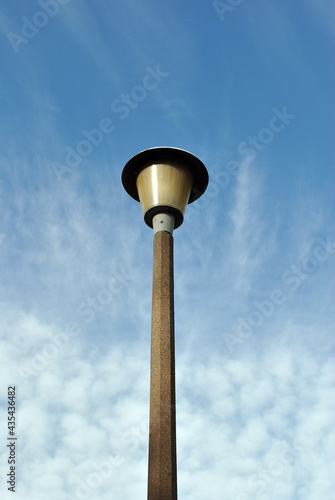 Modern Public Street Light on Single Concrete Post against Blue Sky