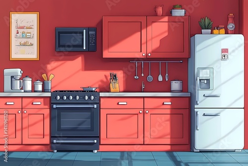 kitchen, red, interior, modern, cooking, appliance, refrigerator, oven, design, furniture, home decor, clean, countertop, utensil, shelf, decorative, artwork, sunlight, rug, stylish, cosy, minimalist, creativity, functional, space, storage, dishwasher, microwave, sink, baking, supply, homelike, friendly, inviting, comfortable, bright, colourful, sanitary, fresh, warmth