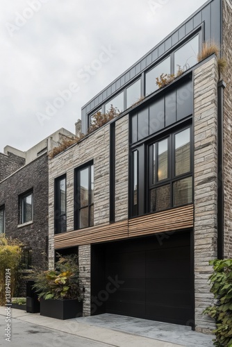 Modern residential architecture showcasing a sleek facade with a blend of stone and wood elements in an urban setting during a cloudy day