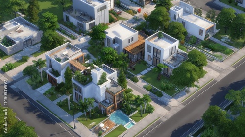 residential, neighbourhood, house, home, architecture, modern, contemporary, urban, design, exterior, building, city landscape, rooftop, garden, landscaping, tree, pool, street, sidewalk, overhead, view, daylight, light, property, illustration, image, digital, city, house, garden, layout, planning, subdivision, housing, visualisation, residential area, isolated, copy space, suburb
