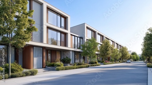 Modern Residential Street with Elegant Architecture and Lush Greenery in a Suburban Neighborhood
