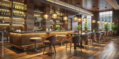 Modern restaurant interior with sleek furniture, empty atmosphere, and elegant decor, featuring a cozy bar area with stylish stools, rich wood accents, and subtle lighting.