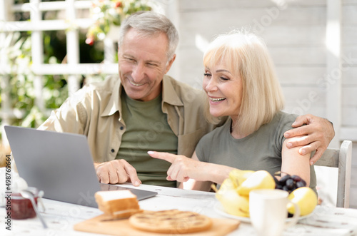 Modern retirement lifestyle concept. Happy senior couple using laptop and browsing internet, sitting outdoors