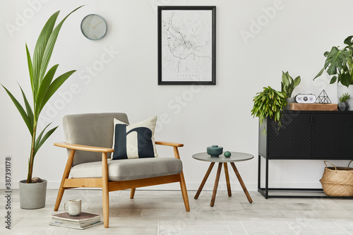 Modern retro concept of home interior with design grey armchair, coffee table, plants, mock up poster map, carpet and personal accessoreis. Stylish home decor of living room.