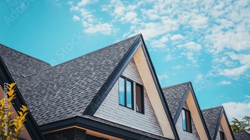 roof, architecture, blue, sky, cloud, residential, modern, neighbourhood, house, gable, shingle, home, building, structure, design, triangular, pattern, exterior, sunny, day, window, facades, symmetry, perspective, angle, sharp, clean, line, urban, scenic, peaceful, contemporary, real, estate, construction, roofing, material, development, housing, skyline, picturesque, bright, weather, clear, horizon