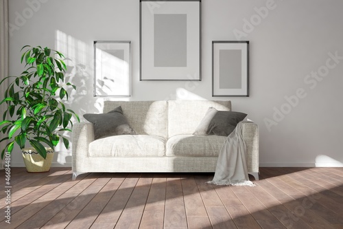 modern room with sofa,pillows,plaid,plant in pt and frames interior design. 3D illustration