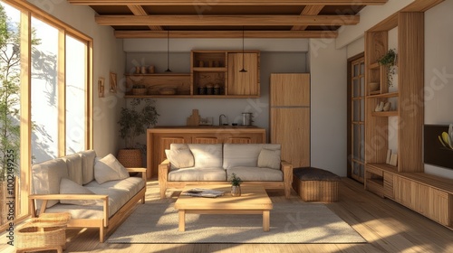 Modern rustic living room with wooden accents, neutral tones, and an open, airy layout.