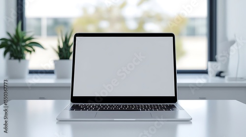 Modern, silver laptop with a blank white screen placed on a clean white desk in a minimalist office setup. Background includes a potted plant and a blurred window view.