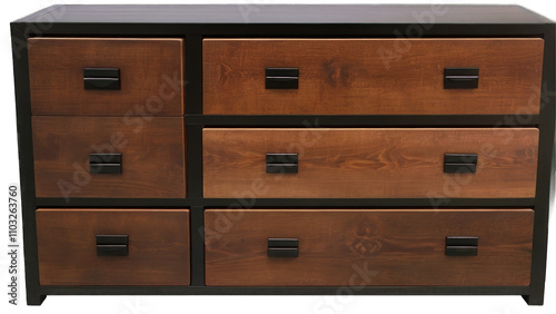 Modern six-drawer dresser with dark frame and light wood drawers transparent background