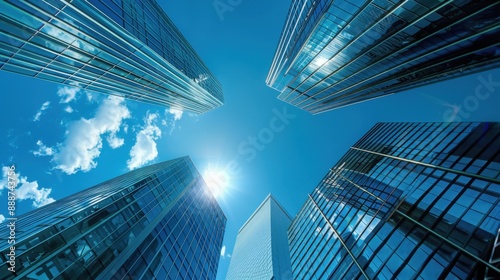Modern skyscrapers with reflective glass against a bright blue sky and sun, symbolizing urban growth and architectural innovation.