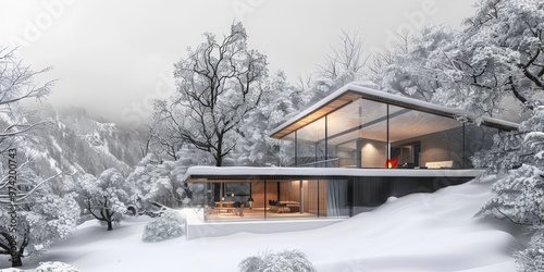Modern snowy mountain cottage with transparent background, sleek design in the Alps