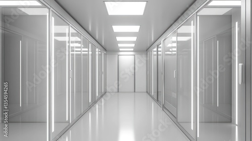 corridor, hallway, sterile, clean, modern, glasses, door, lighting, bright, white, wall, floor, ceiling, minimalist, futuristic, sleek, shiny, reflective, interior, design, architecture, space, laboratory, medicals, office, technology, clinical, hospital, panel, line, illumination, light, contemporary, aesthetic, simple, pure, roomy, environment
