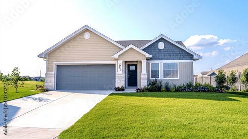 house, home, suburban, modern, architecture, building, exterior, beige, siding, grey, garage, lawn, green, grass, landscaping, driveway, front, door, window, residential, property, real estate, new home, contemporary, style, design, dwelling, bungalow