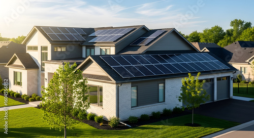 Modern Suburban House with Solar Panels at Sunset