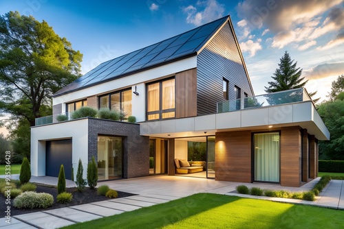 Modern Sustainable Home: A sleek and stylish modern house with solar panels on the roof, showcasing an environmentally conscious and energy-efficient design. The home features a spacious balcony,