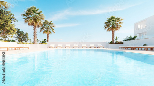 modern swimming pool surrounded by sun loungers and palm trees creates serene and inviting atmosphere. clear blue water reflects bright sky, enhancing tranquil setting