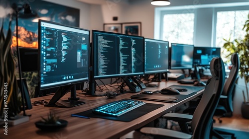 Modern tech workspace with multiple monitors, ergonomic chairs, and a minimalist setup for digital professionals