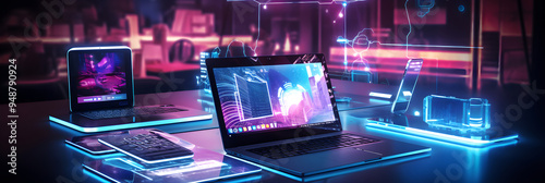 technology, laptop, smartphone, tablet, sleek, modern, digital, connectivity, minimalist, clean, innovative, device, workspace, home office, advanced technology, electronic, web, cyberspace, communication, hardware, earphones, router, wi-fi, convenience