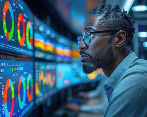 Modern Technology Business Professional Analyzing Data on Multiple Monitors in Sleek Office Environment