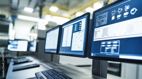 Modern Technology Workspace Featuring Multiple Monitors Displaying Various Technical Data and Graphical Information in a Bright Industrial Environment
