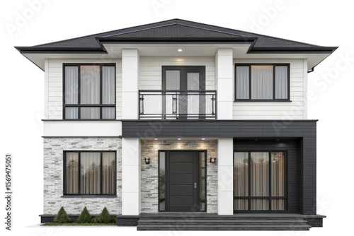 Modern two story white and gray brick house with black accents isolated on transparent background