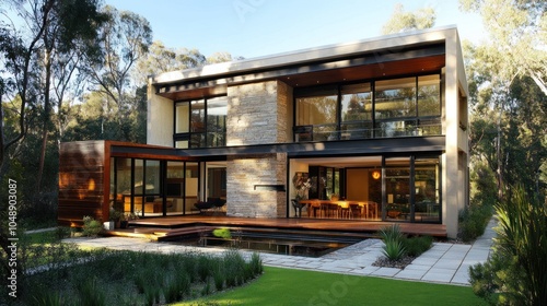 Modern Two-Story Home with Stone Facade and Pool in a Lush Forest Setting