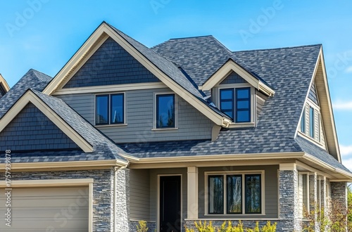 Modern two-story house with gray shingles, stone accents, multiple windows, and a garage under a clear blue sky