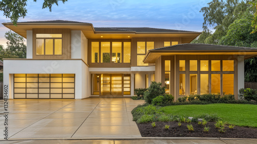 modern, house, suburban, large, window, dusky, sky, inviting, exterior, driveway, garage, landscaping, architecture, home, design, warm, lighting, wood, accent, peaceful, neighbourhood, elegant, style, residential, area, evening, view, front, yard, contemporary, suppressing, attracted, clean, line, glasses, door, entrance, space, lush, greenery, welcoming, roomy, layout, cosy, ambience