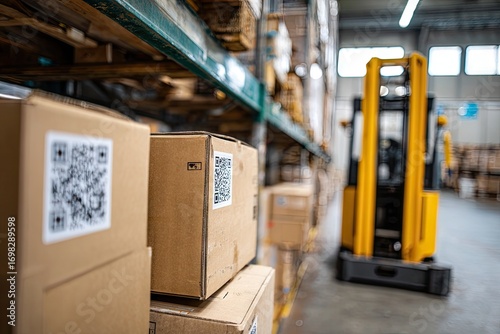 warehouse, storage, box, forklift, logistic, industry, cargo, shipping, distribution, inventory, supply, chain, industrial, factory, men at work, loading, unloading, pallet, rack, shelf, good, merchandise, product, delivery, transport, automation, technology, scanning, barcode, interior, building, commercial, business, operation, management, efficiency, modern, clean, organised, equipment, machinery, yellow, aisle, concrete, floor, light, design, manufacturing