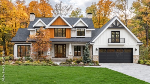 house, home, modern, farmhouse, architecture, exterior, white, garage, door, black, fall, foliage, autumn, leaf, tree, landscaping, lawn, green, stone, driveway, porch, window, front, view, design, luxury, beautiful, residential, real estate, property, building, structure, front yard, garden, style