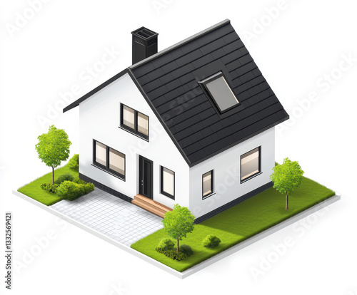 modern white house with a black pitched roof, large windows, and a skylight. The neatly landscaped yard with green grass and trees enhances its minimalist and contemporary aesthetic
