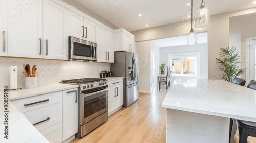 kitchen, modern, interior, design, white, cabinet, appliance, countertop, flooring, decor, home, house, property, style, contemporary, minimalist, elegant, stylish, luxury, bright, clean, roomy, airy, open, plan, island, cooking, dining, living, room, furniture, lighting, window, plant, stainless, steel, wood, quartz, new, homeowner