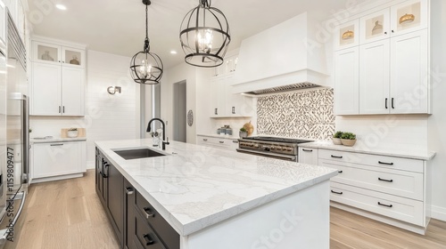 kitchen, interior, home, design, decor, white, modern, elegant, lighting, furniture, countertop, appliance, sink, cabinet, tile, space, minimalist, architecture, home improvement, renovation, stylish, aesthetic, cosy, wood, marble, pendant, fixture, roomy, layout, contemporary, room, culinary, utensil, organisation, harmony, comfort, clean, fresh, bright, texture, finish, residential, luxury, atmosphere, ambience, visual, elegance, beauty