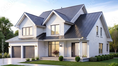 Modern White Suburban House Exterior, Gray Roof, Large Windows - Architectural Photography