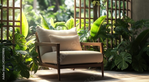 Modern wooden armchair sits in front of an open window with lattices, surrounded by lush greenery and sunlight filtering through the leaves