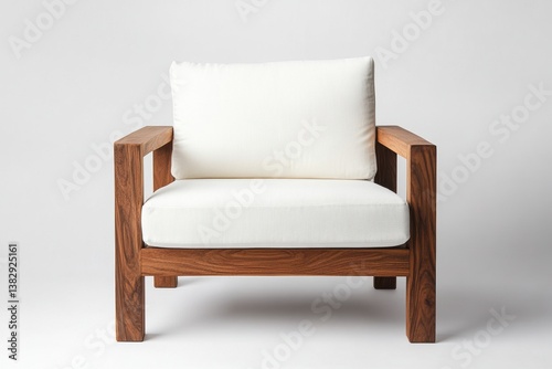Modern wooden armchair with white cushions. Simple, minimalist design