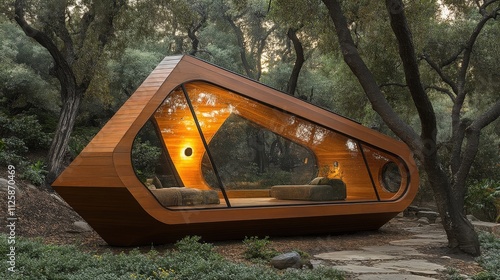 Modern Wooden Cabin Nestled in Lush Forest, Featuring Unique Angled Design and Expansive Glass Walls for an Inviting Outdoor Experience