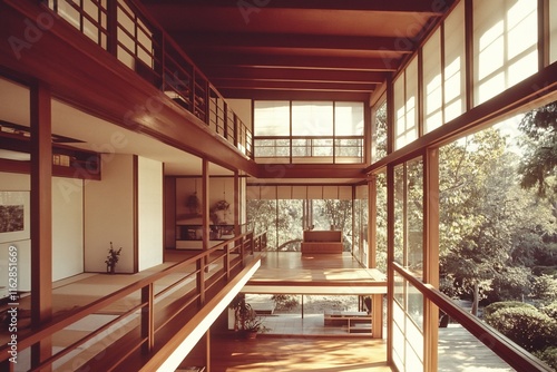 house, interior, modern, wood, architecture, home, design, building, room, window, garden, view, ceiling, balcony, floor, space, structure, style, dwelling, residence, apartment, real estate, living, contemporary, japanese, asian, tranquil, serene, peaceful, calm, light, bright, airy, roomy, open, plan, line, elegant, luxury, comfort, warmth, natural, beam, glasses, wall, decor, furniture