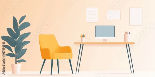 workspace, chair, desk, computer, plant, indoor, office, room, minimalist, home, furniture, comfort, element, design, equipment, palette, colours, arrangement, structure, ambience, attracted, creative, aesthetic, cosy, refresh, layout, lifestyle, yellow, balance, background