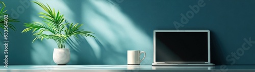 Modern workspace with an open laptop, coffee mug, and green plant on a desk against a teal wall in sunlight, creating a calm and productive environment.