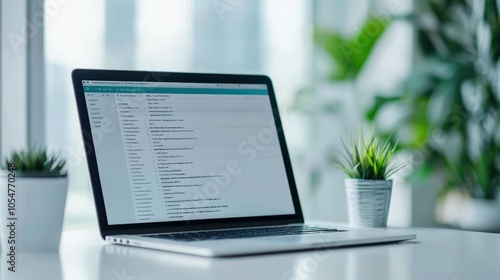 laptop, workspace, indoor, plant, modern, technology, office, productivity, workstation, greenery, design, screen, contemporary, home office, minimalist, sharpened, professional, clean, bright, ergonomic, arrangement, computer, open space, working environment
