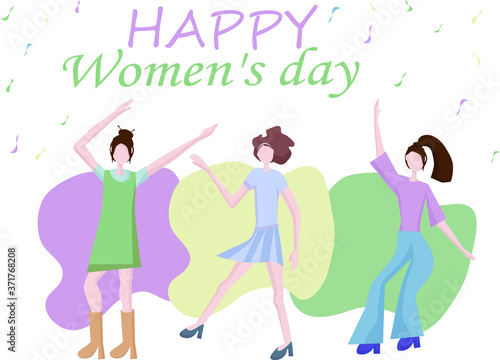 Modern young girls are dancing. Dance moves, fun and entertainment. Women's friendship and common leisure. Together will celebrate the International Women's Day. Flat design