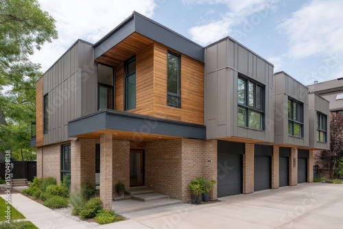 modular, duplex, aluminium, siding, warm, brick, accent, midday, overhead, light, shadow, minimal, composition, tone, balance, architecture, exterior, building, modern, construction, design, facades, business, structure, city, urban, estate, cement, window, floor, block, skyscraper, architectural, front, commercial, home, luxury