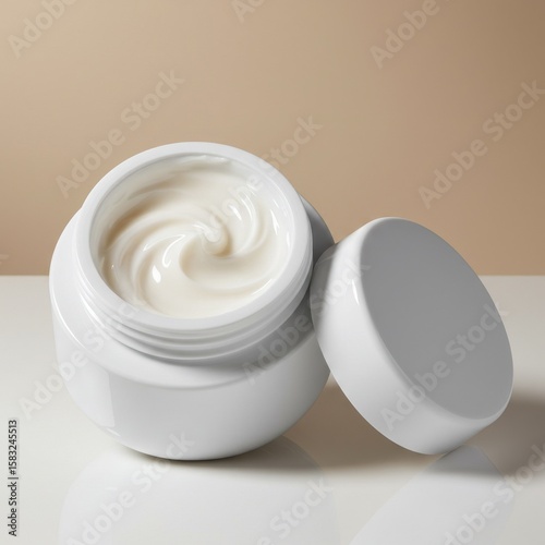 cream, moisturiser, jar, skincare, beauty, product, cosmetic, white, smooth, texture, container, design, health, professional, natural, clean, luxury, glossy, daily, application, closeup, indoor, neutral, surface, lid, pampering, hydratation, feminine, freshness, routine, elegant, stylish, minimal, beauty product, contemporary, cardboard box, lotion, dermatology, wellness, simplicity, quality, aesthetic, serum