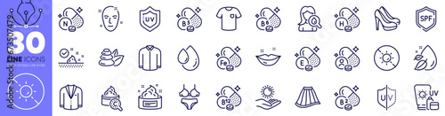 Moisturizing cream, Spa stones and Pantothenic acid line icons pack. Shoes, Shirt, Spf protection web icon. Sun protection, Riboflavin vitamin, Collagen skin pictogram. Water drop, Skirt, Iron. Vector