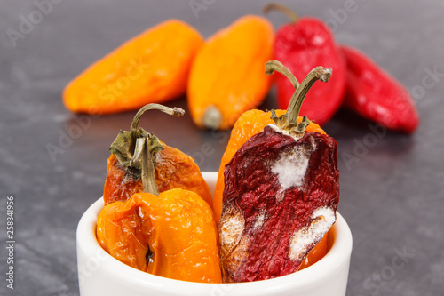 pepper, food, vegetable, inedible, unhealthy, disgust, disgusting, fungal, molded, moldy, rotten, spoiled, decompose, damaged, infected, unpleasant, waste, garbage, contaminate, old, bad, organic, wrinkled, white, bowl