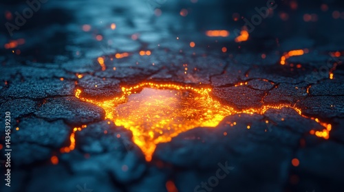lava, molten, fractured, ground, heat, fire, orange, blue, texture, surface, geology, volcanic, geothermal, hot, danger, energy, abstract, pattern, nature, landscape, vibrant, glowing, fissure, magma, earth, rock, terrain, environment, destruction, power, intense, bright, dark, background, closeup