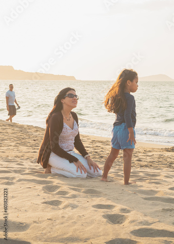 mom and 4 year old daughter on the beach in an idyllic sunset, Shot of a young woman spending time at the beach with her adorable daughter, Mother and daughter holding hands, running jumping on sunny
