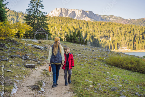 Mom and son tourists in background of Panoramic morning view of Black Lake Crno Jezero. Calm summer scene of Durmitor Nacionalni Park, Zabljak location, Montenegro, Europe. Beauty of nature concept