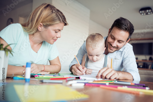 Mom, dad and son draw in the living room.